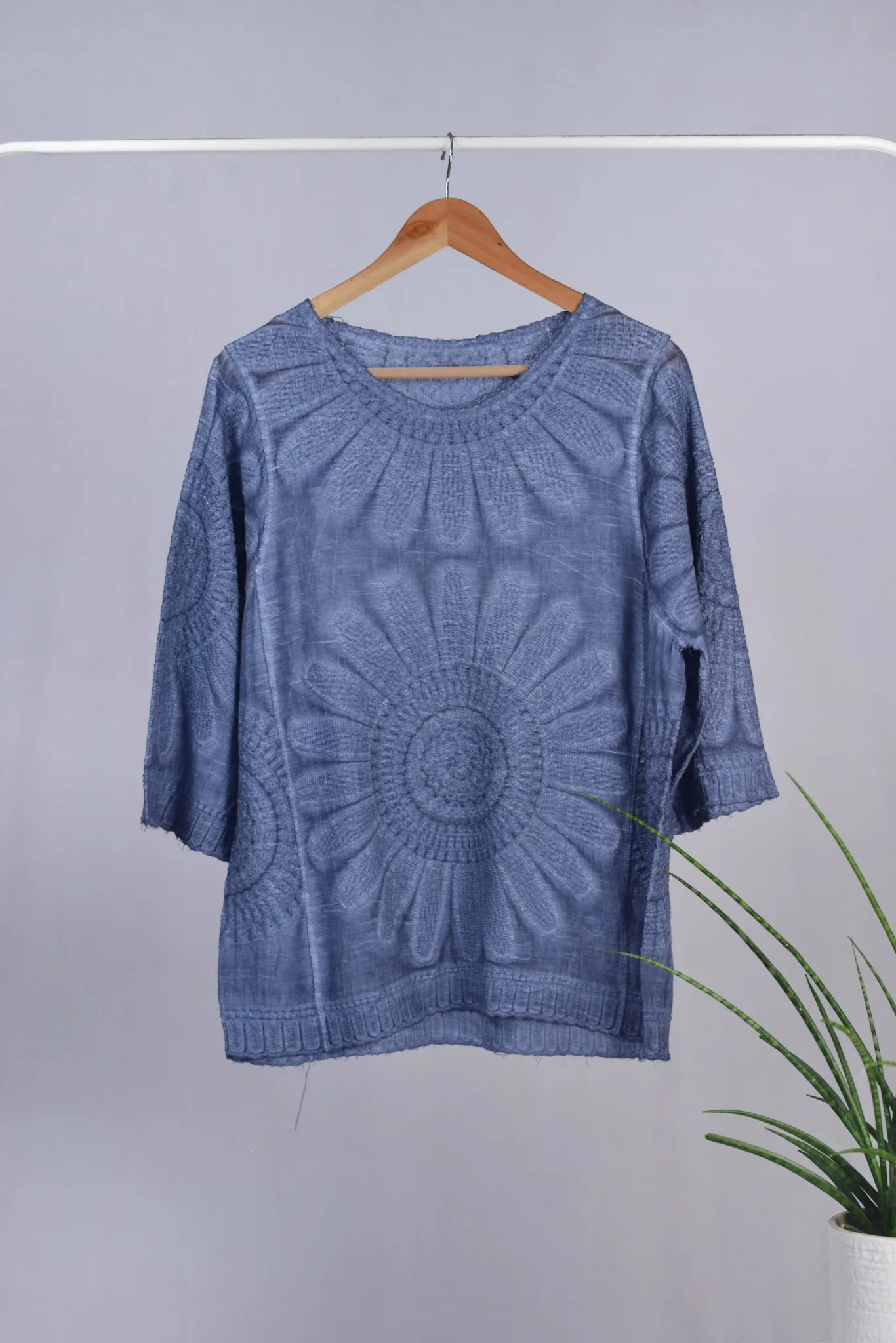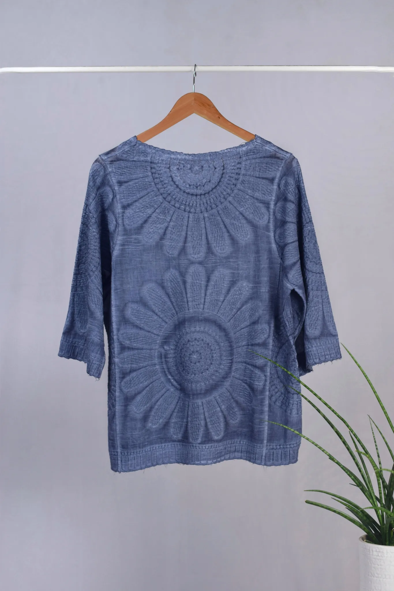 Whether you’re looking for a statement piece to elevate your everyday outfits or a cozy sweater to keep you warm during the colder months, this blue sweater with a flower design is the perfect choice. Pair it with your favorite jeans and sneakers for a casual look, or dress it up with a skirt and heels for a more polished ensemble. Add this versatile and stylish sweater to your wardrobe today!