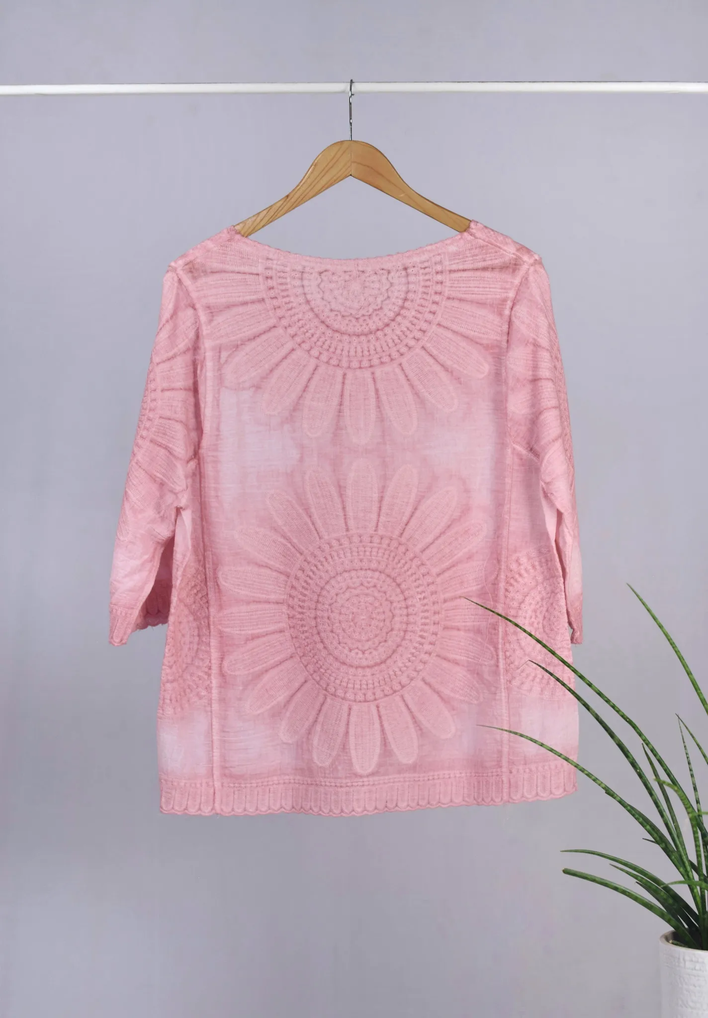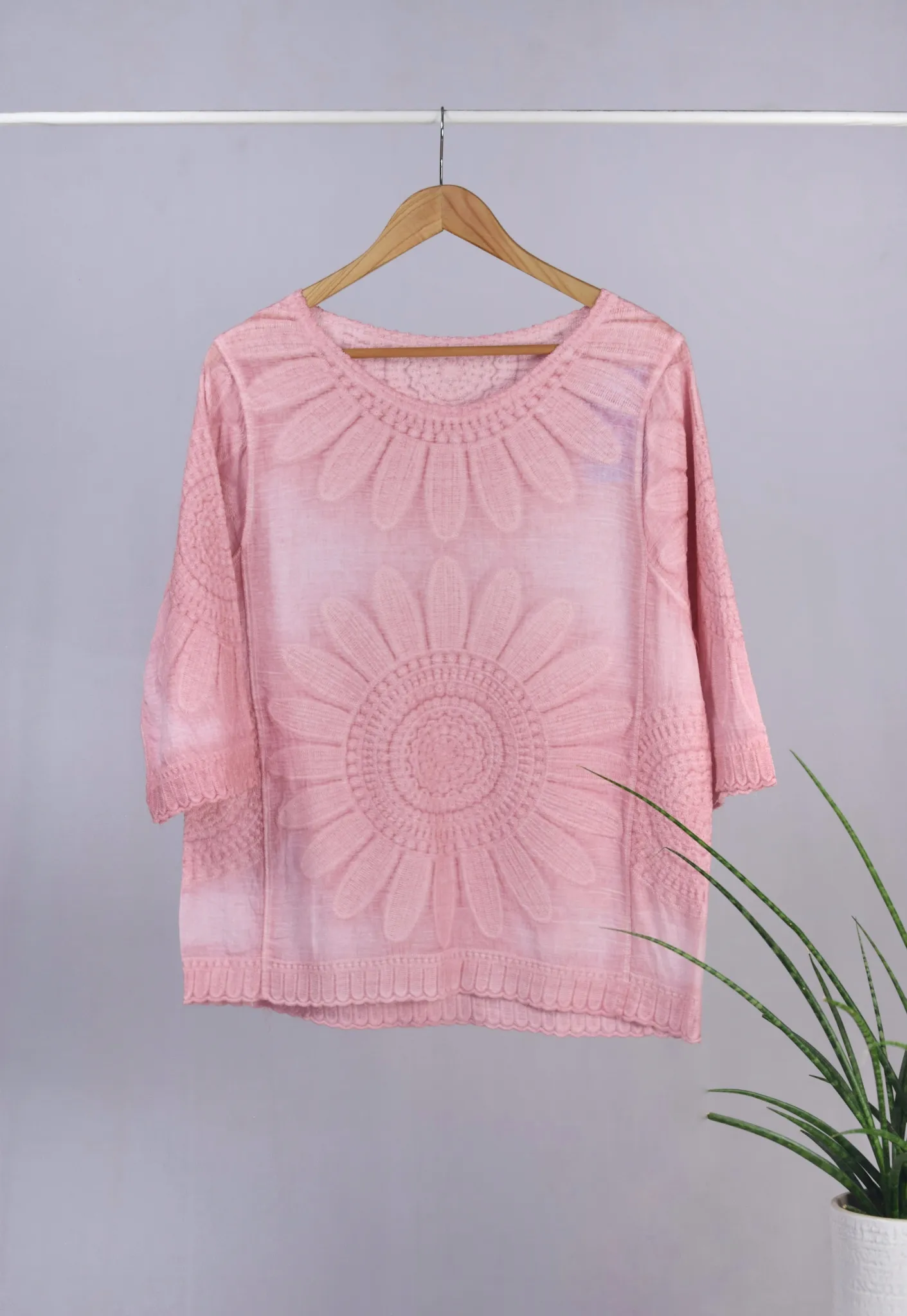 Made from high-quality cotton, this top is not only stylish but also breathable and easy to care for. Pair it with your favorite jeans for a relaxed look, or dress it up with a skirt and heels for a more polished ensemble. Whether you’re running errands or meeting friends for brunch, this pink top with a flower pattern is sure to become a staple in your closet.