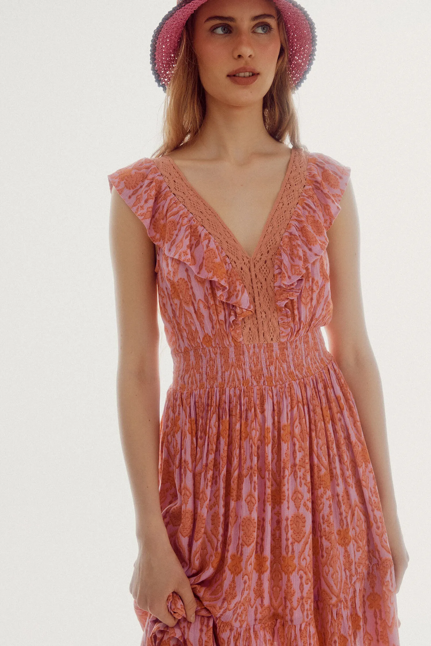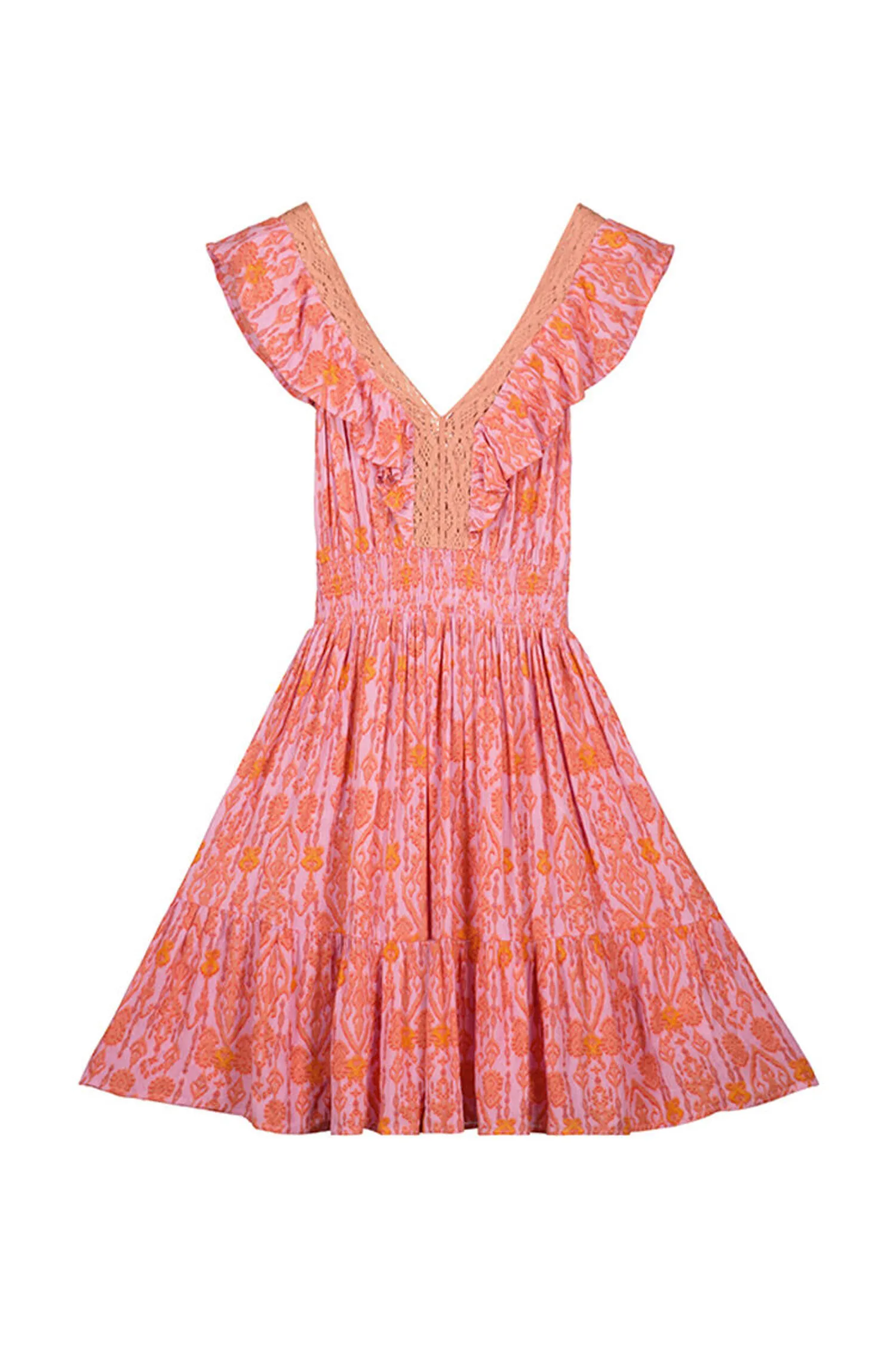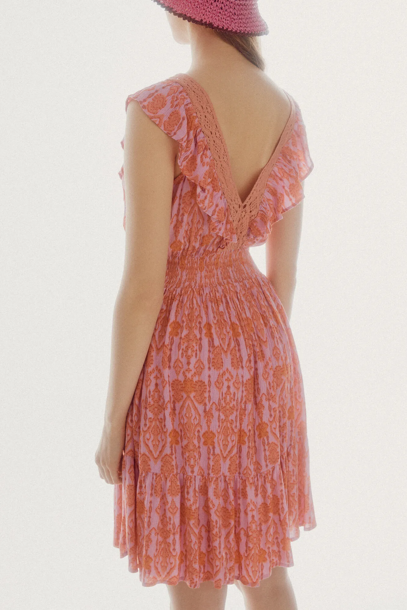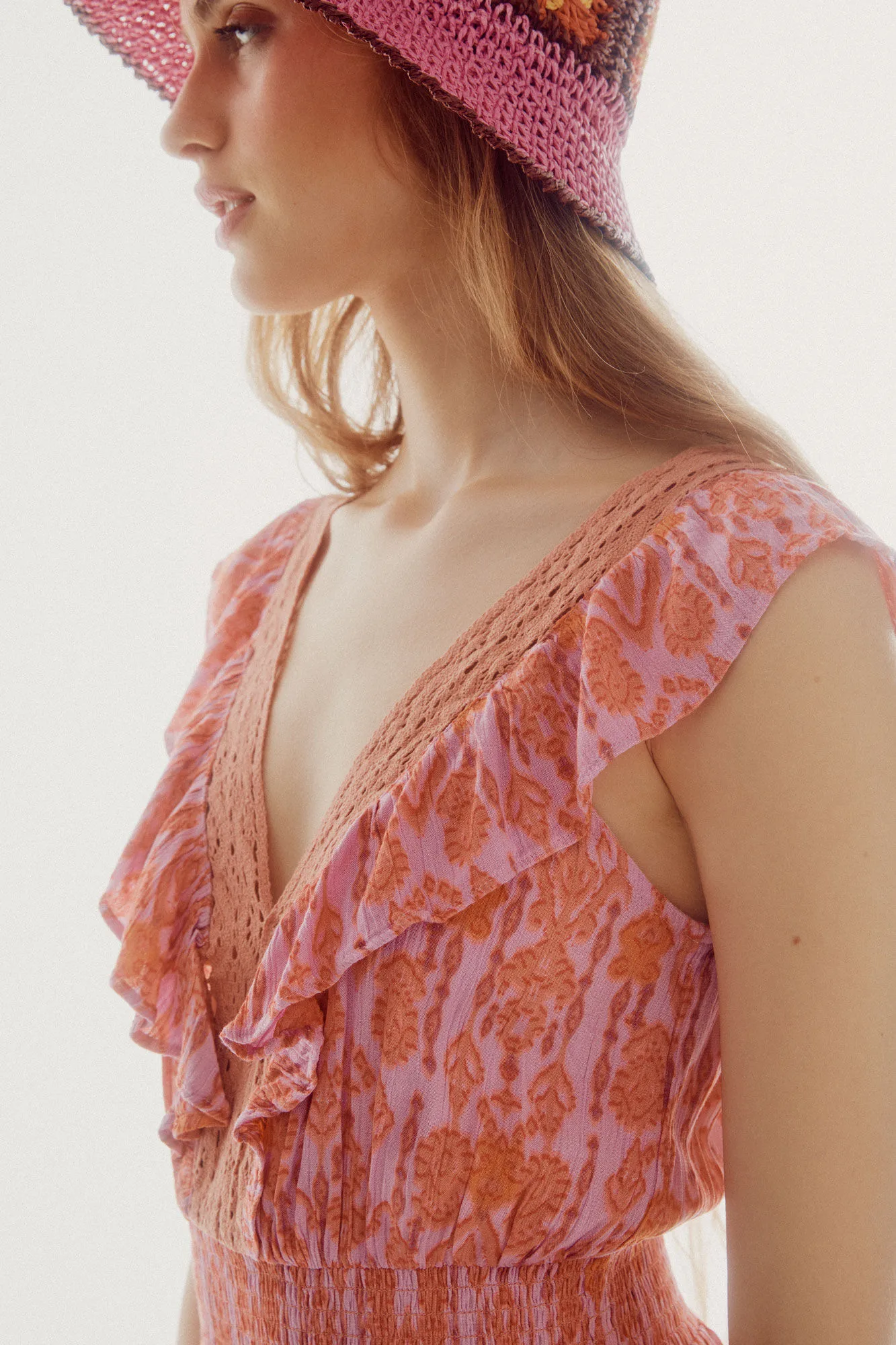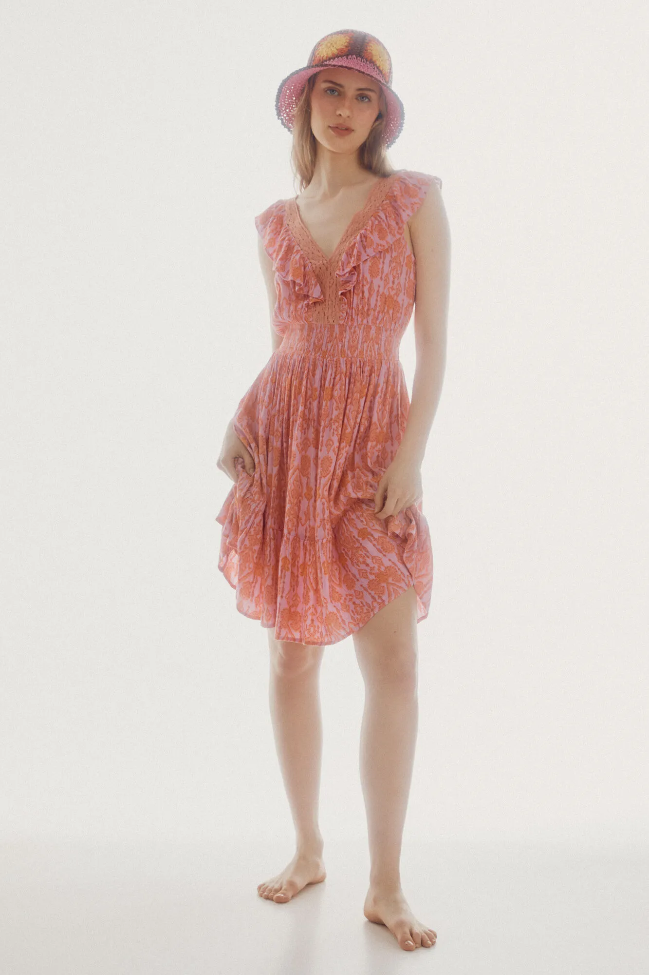 Short printed dress in sustainable fabric. Sleeveless V-neckline. Detail of matching entredos and ruffle. Wide elastic honeycomb waist. Low finish on steering wheel.